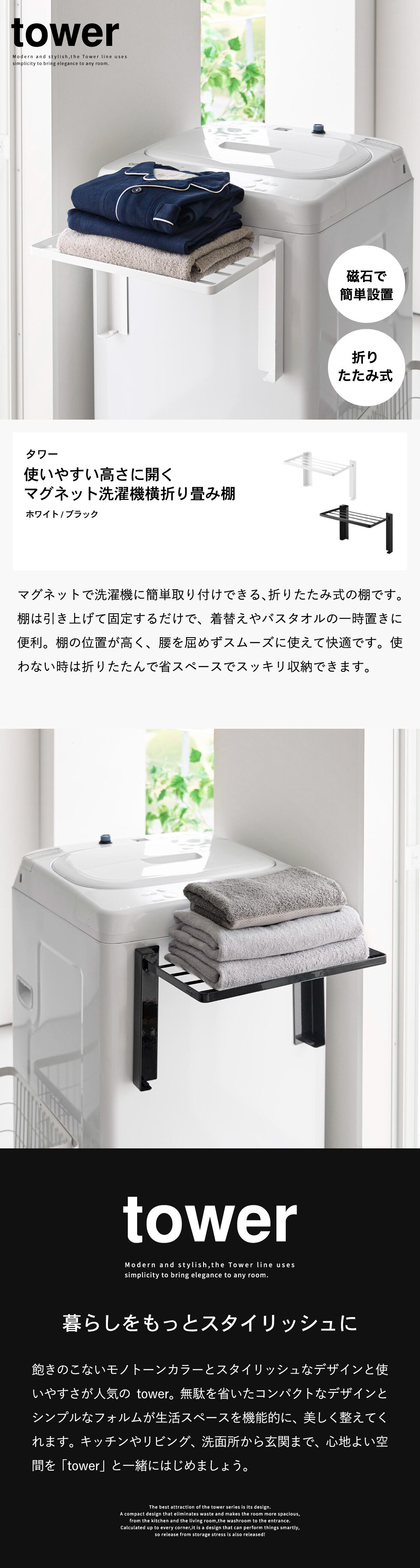 山崎実業 tower 使いやすい高さに開くマグネット洗濯機横折り畳み棚 タワー 公式 10019 10020 送料無料 / 洗濯機ラック 洗濯機横 収納 洗面所 脱衣所 タオルラック タワーシリーズ yamazaki / ブラックのレビュー