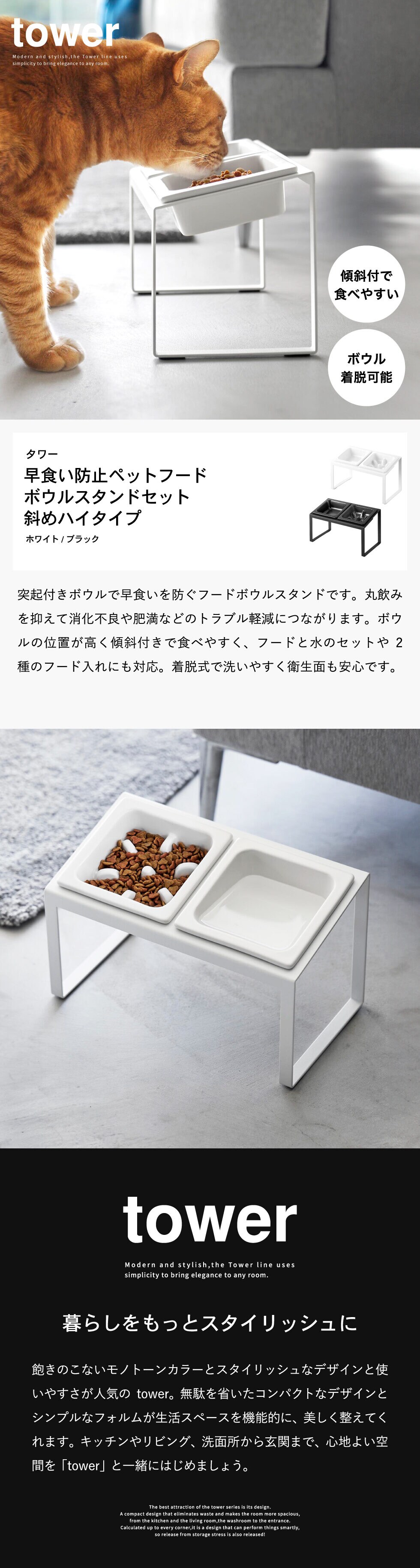 山崎実業 tower 早食い防止ペットフードボウルスタンドセット タワー 斜めハイタイプ 山崎実業 tower 10241 10242 送料無料 / ボウル2個セット 傾斜付き ハイタイプ 15cm ペット用食器 ペット用品 yamazaki / ホワイト