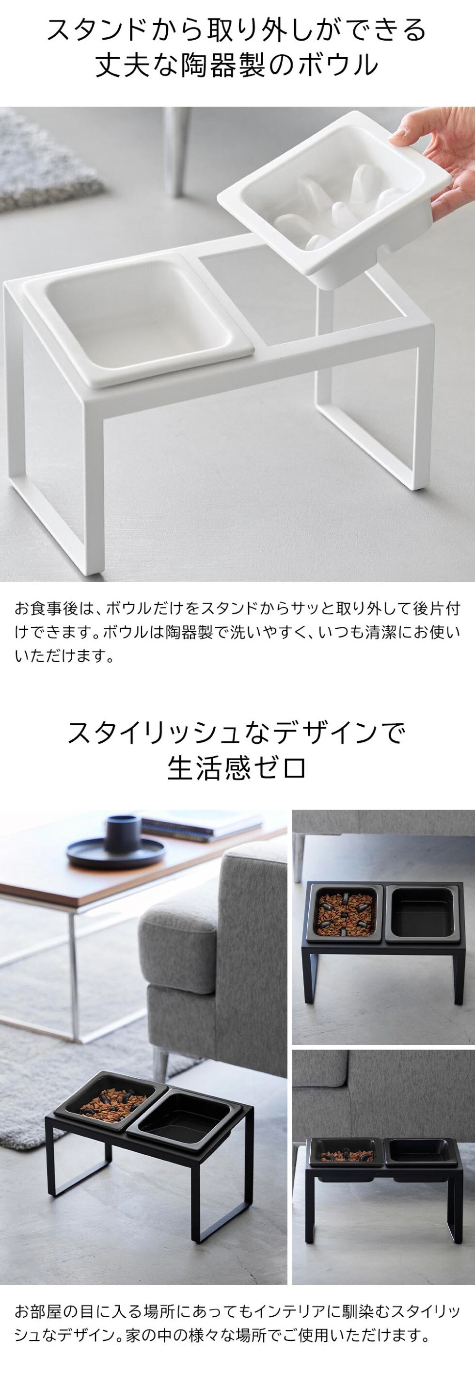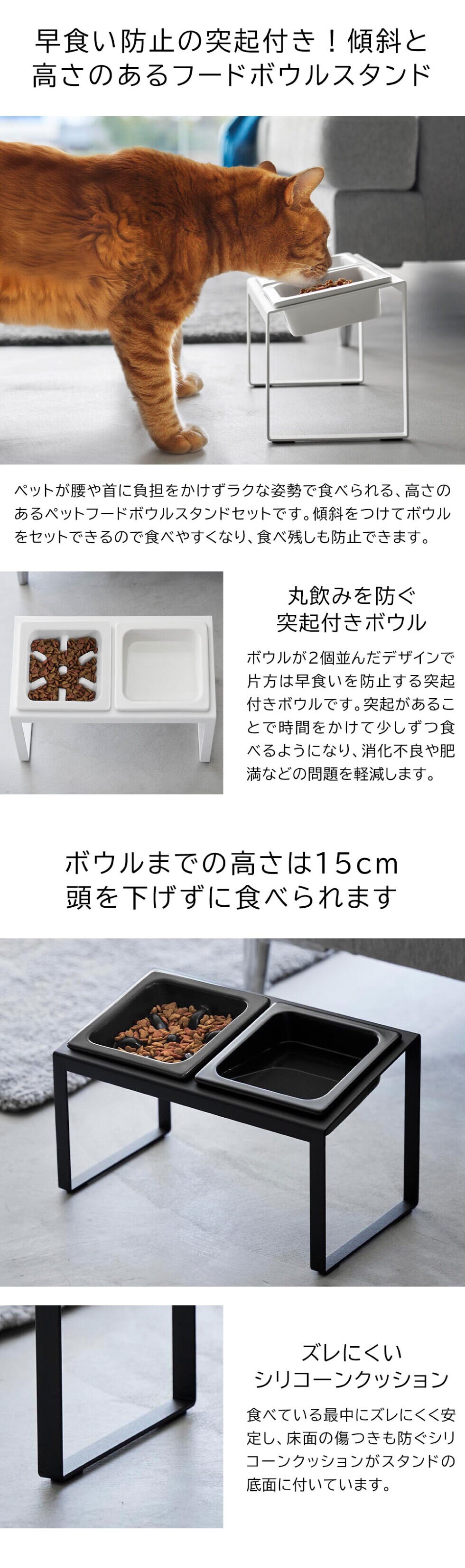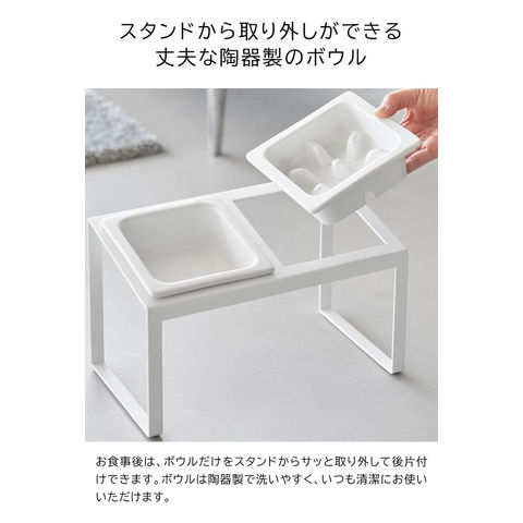 品質表示 スタンド:スチール(粉体塗装) クッション:シリコーンゴム ボウル・早食い防止ボウル:陶器 |
