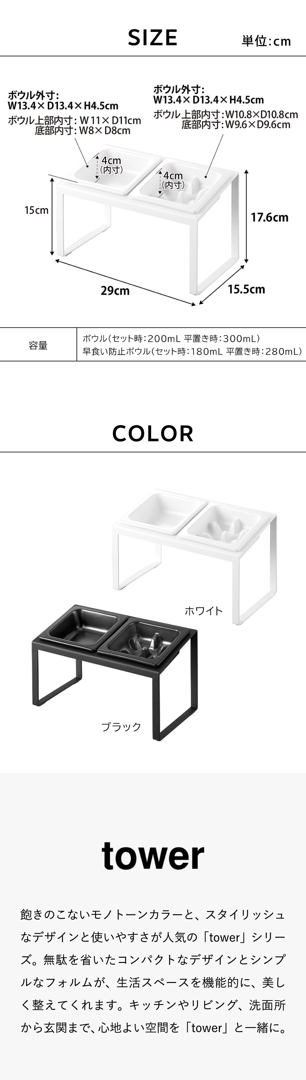容量 ボウル(セット時:200mL 平置き時:300mL) 早食い防止ボウル(セット時:180mL 平置き時:280mL) |