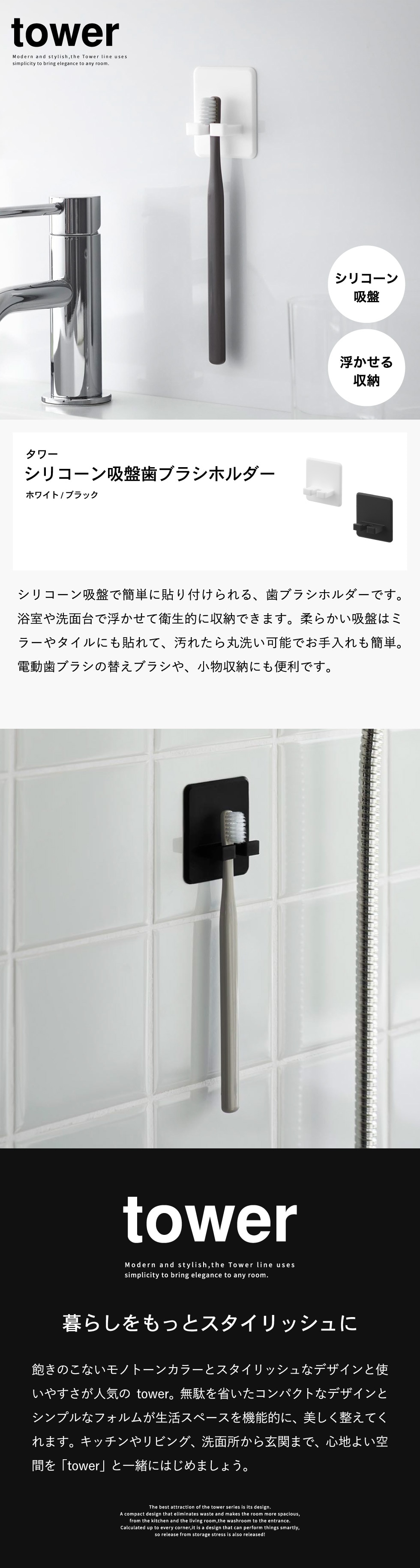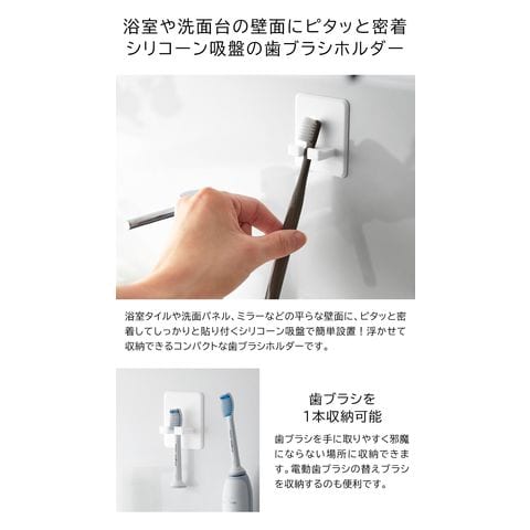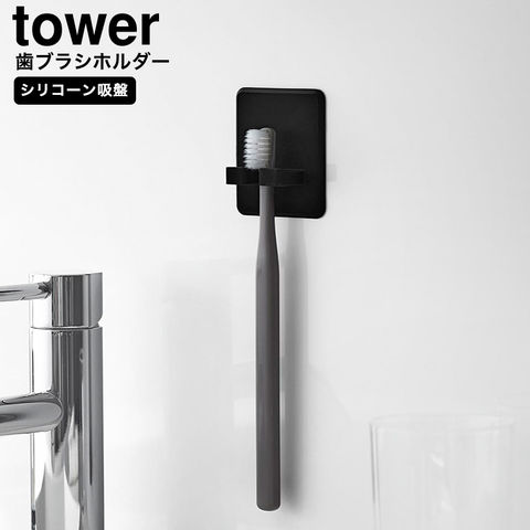 山崎実業 tower シリコーン吸盤歯ブラシホルダー タワー 公式 10296 10297 / 歯ブラシスタンド ハブラシ 歯ブラシ立て 歯ブラシ置き 歯ブラシ台 バスルーム お風呂 洗面所 洗面台 吊り下げ 収納 / ブラック