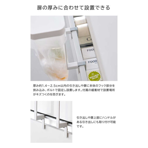 取り付け可能な引き出し・扉 幅:18cm以上(扉のハンドル等を含まず) 厚さ:1.4~2.5cm 上部との隙間:0.3cm以上 ※本製品は屋内の一般的な平面の流し台や洗面台の引き出し・扉を対象にしています。 ※ガラス戸やキズのつきやすい引き出し・扉へのご使用はお避けください。 ※設置する引き出し・扉のサイズや厚さ、形状、材質によっては取り付けできない場合があります ※プッシュオープン扉は取り付けできません。 |
