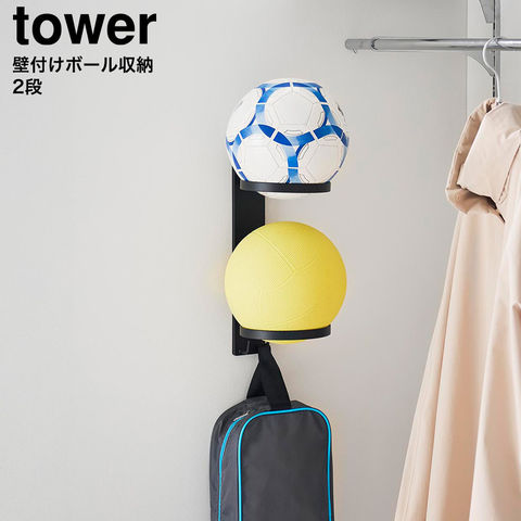 山崎実業 tower 壁付けボール収納 タワー 2段 公式 10348 10349 ホワイト ブラック 送料無料 / ボールスタンド ボールラック サッカーボール バスケットボール バレーボール 玄関収納 子供部屋 シューズケース リュック yamazaki JGS / ブラック