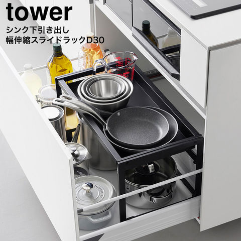 山崎実業 tower シンク下引き出し幅伸縮スライドラック タワー D30 10356 10357 送料無料 / 幅58.8~90cm 伸縮ラック 収納ラック スライドラック 棚 コンロ下 システムキッチン キッチン収納 / ブラック