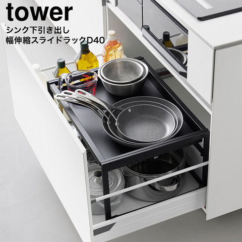 山崎実業 tower シンク下引き出し幅伸縮スライドラック タワー D40 10358 10359 送料無料 / 幅58.8~90cm 伸縮ラック 収納ラック スライドラック 棚 コンロ下 システムキッチン キッチン収納 / ブラック