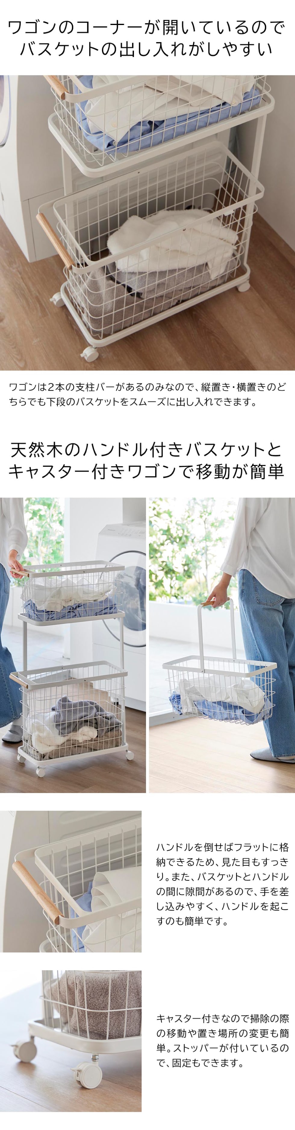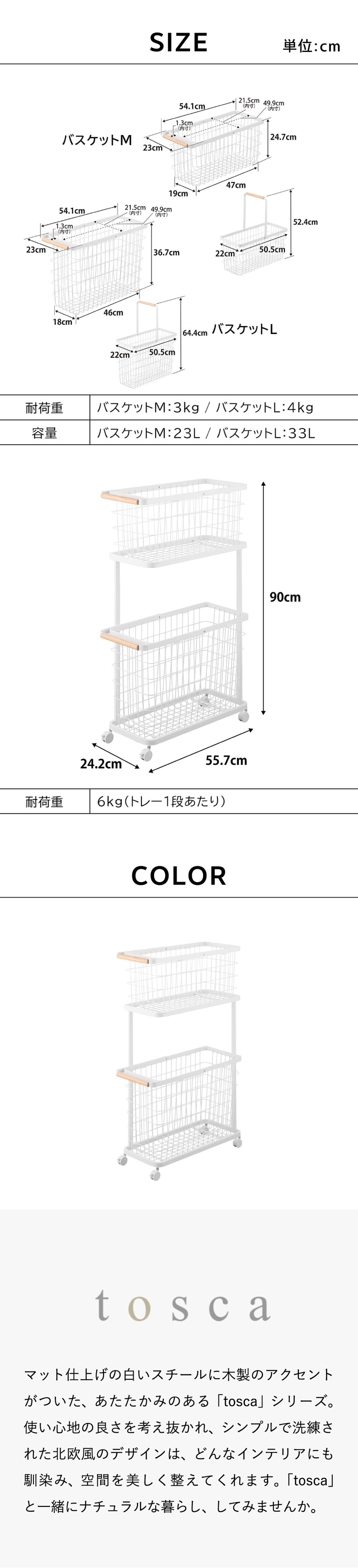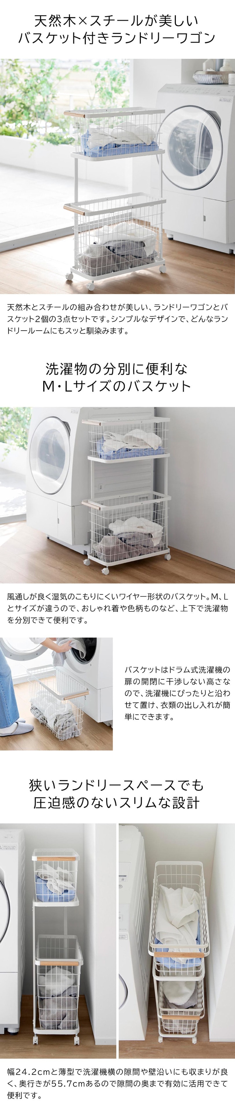 商品サイズ W24.2×D55.7×H90cm ワゴン:W22.5×D53×H68cm バスケットM:W23×D54.1×H24.7cm バスケットL:W23×D54.1×H36.7cm |