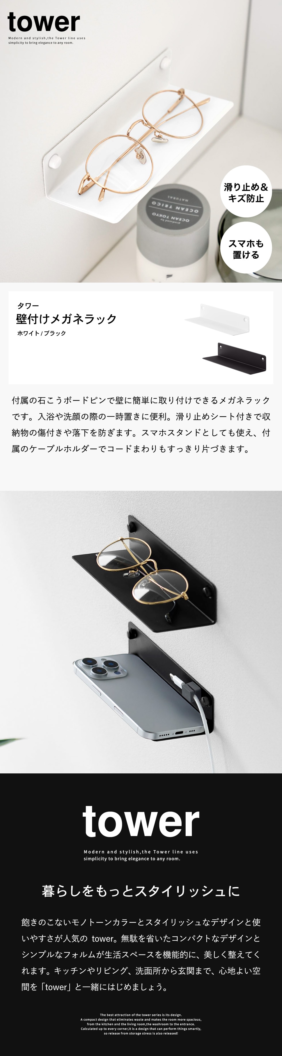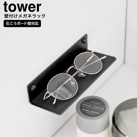 山崎実業 tower 壁付けメガネラック タワー 公式 10446 10447 / メガネ置き 眼鏡置き スマホ ウォールラック 石こうボード壁対応 ケーブルホルダー付き 洗面台 タワーシリーズ / ブラック