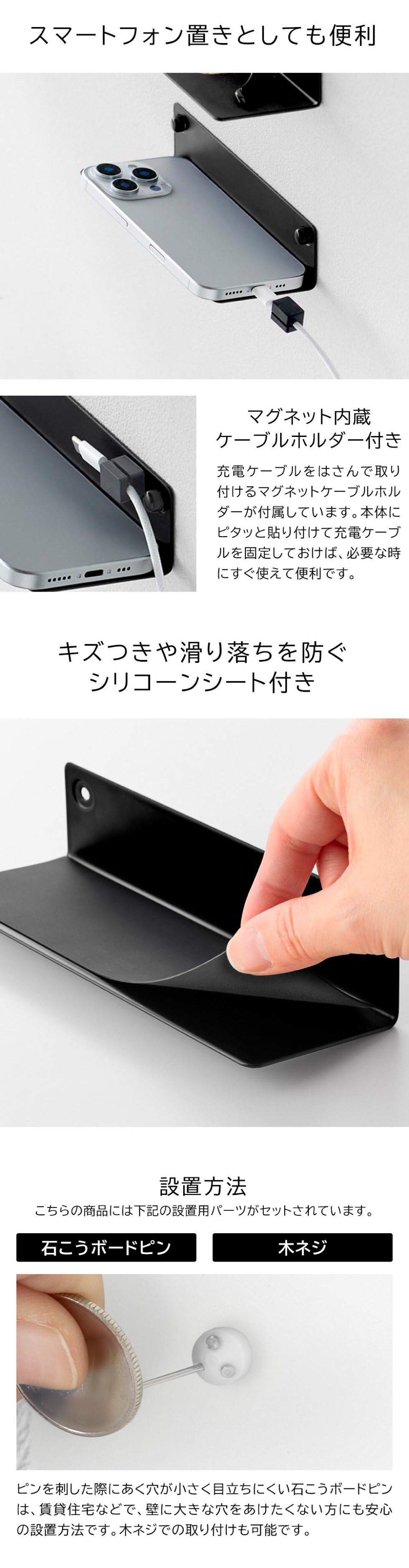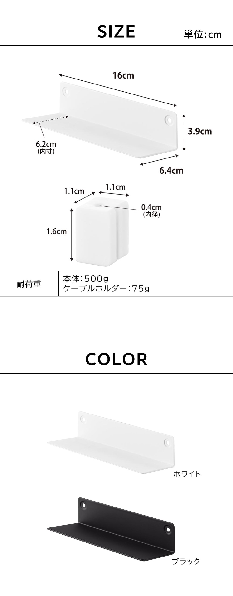 内寸サイズ 棚板:W16×D6.2cm ケーブルホルダー:内径4mm |