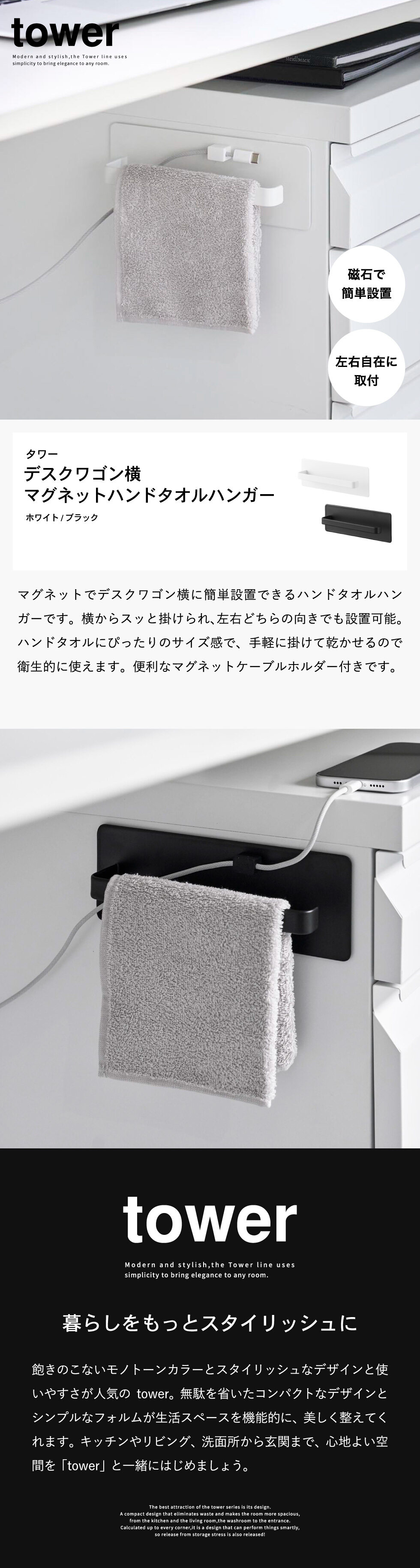 山崎実業 tower デスクワゴン横マグネットハンドタオルハンガー タワー 公式 10448 10449 / タオルハンガー タオル掛け ケーブルホルダー オフィス 机 収納 タワーシリーズ yamazaki JGS / ブラック