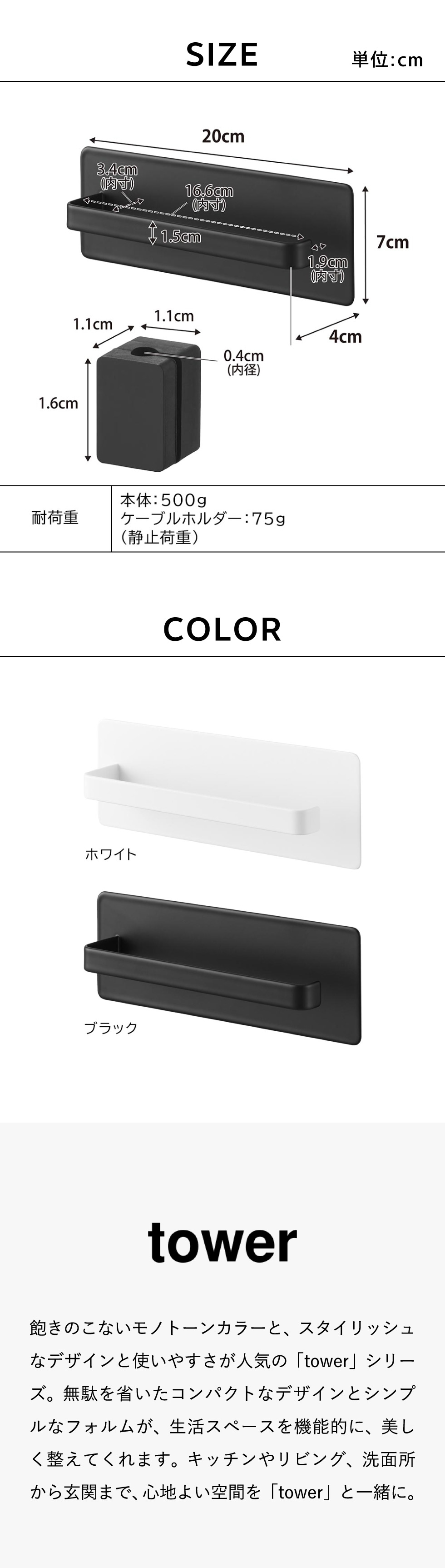 商品サイズ 本体:W20×D4×H7cm ケーブルホルダー:W1.1×D1.1×H1.6cm |