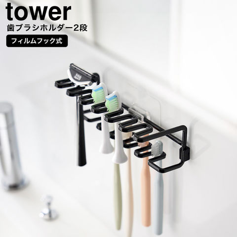 山崎実業 tower フィルムフック歯ブラシ&替え歯ブラシホルダー タワー 2段 公式 10480 10481 / 歯ブラシホルダー 歯ブラシ立て 歯ブラシスタンド 洗面所 洗面台 タワーシリーズ / ブラック