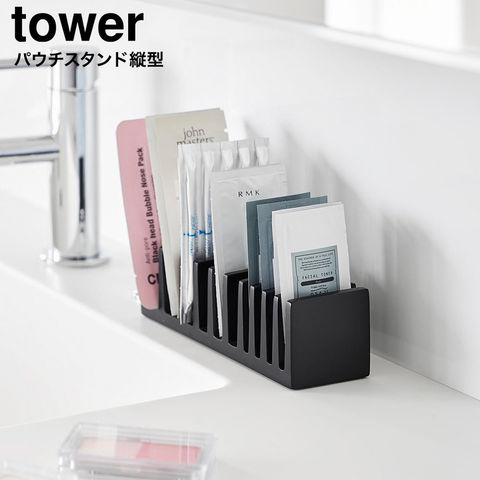 山崎実業 tower パウチ&アメニティスタンド タワー 縦型 公式 10573 10574 ホワイト ブラック / 化粧品サンプル シャンプー サンプルパウチ 洗面戸棚 小物整理 化粧品収納 ホテル 洗面台 洗面所 yamazaki JGS / ブラック