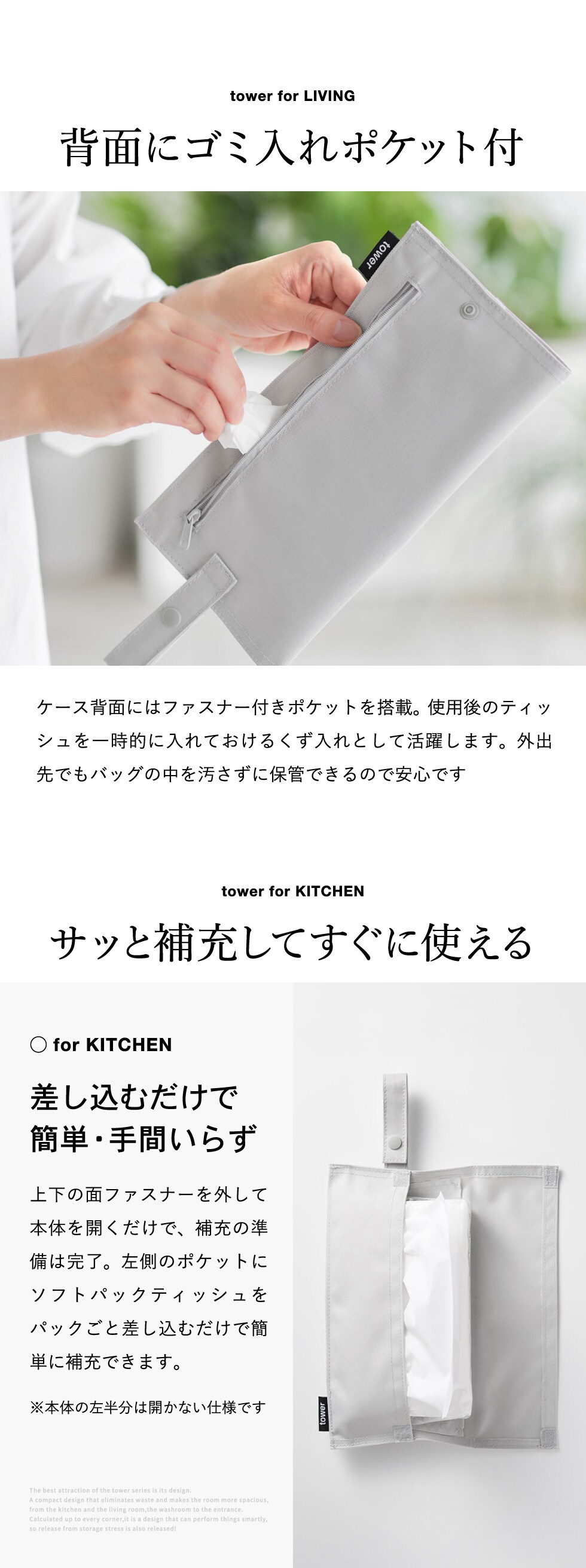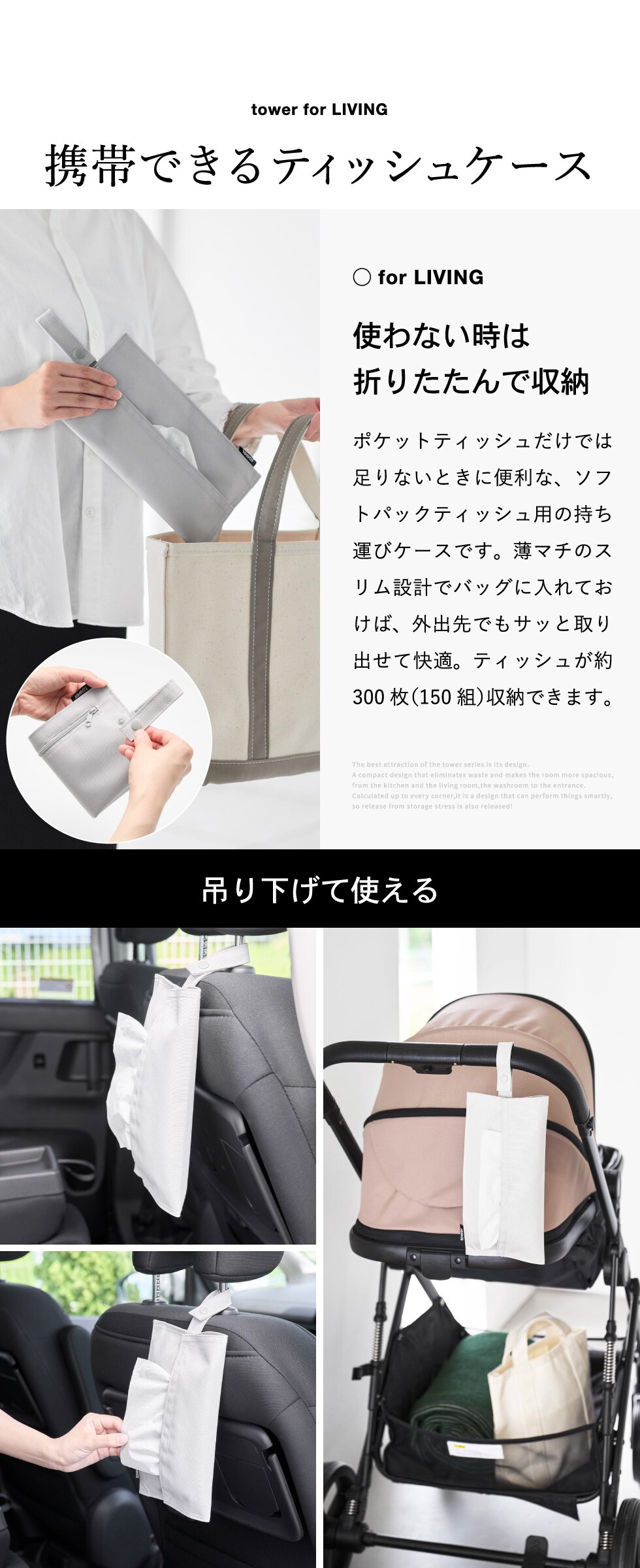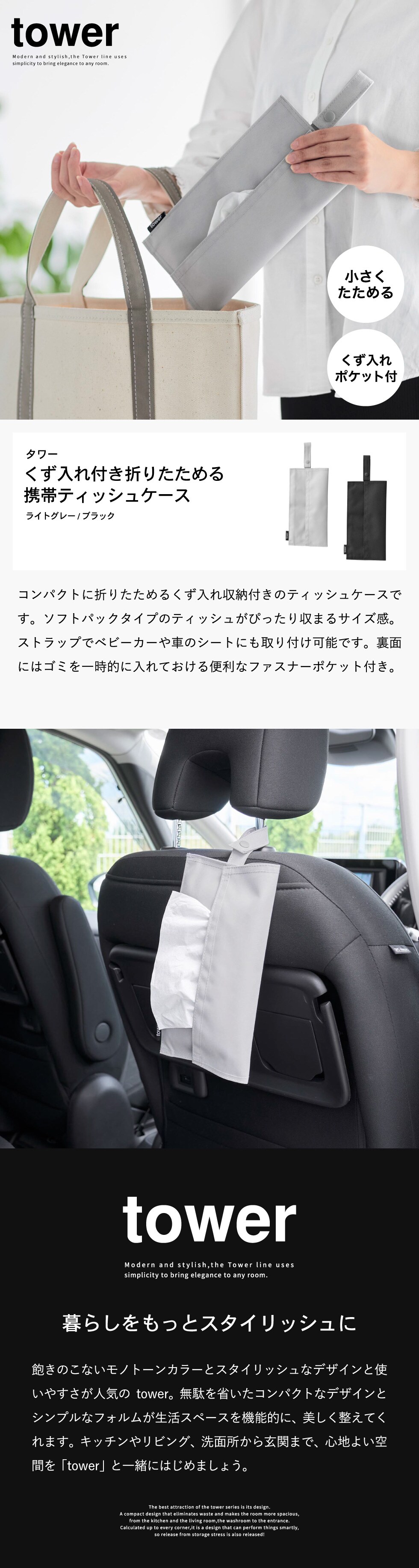 山崎実業 tower くず入れ付き折りたためる携帯ティッシュケース タワー 公式 10735 10736 ライトグレー ブラック / ティッシュカバー ティッシュボックス 吊り下げ 車用品 車内 ベビーカー 花粉症 携帯用 / ブラック