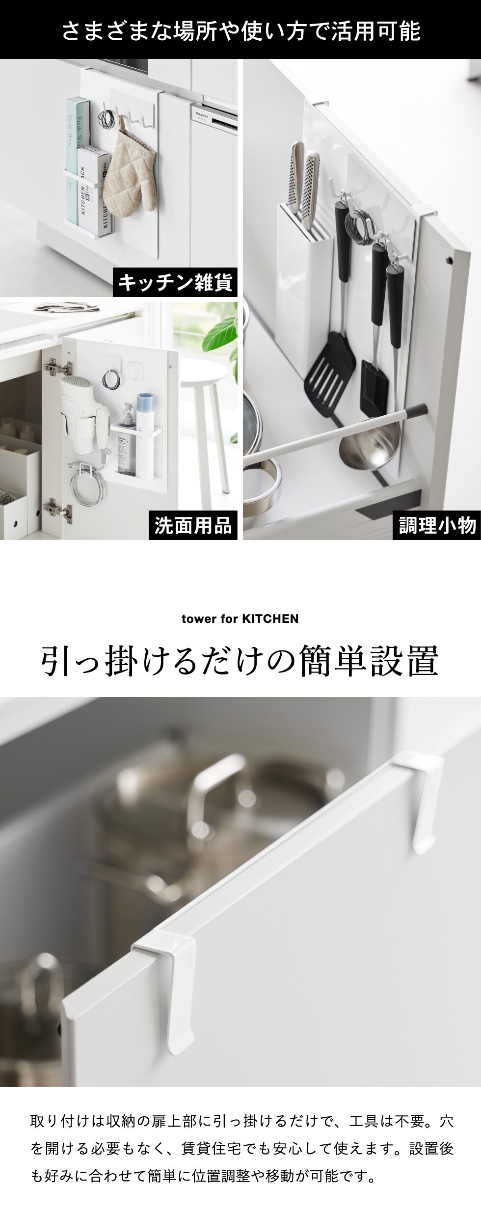 ●取り付け可能な扉 幅:30cm以上(扉のハンドルや蝶番・金具等を含まず) 厚さ:1.5~2.2cm以内 扉と上部との隙間:3mm以上 ※本製品は屋内の一般的な平面の流し台・洗面台の扉を対象にしています。※ガラス戸やキズつきやすい扉へのご使用はお避けください。 ※取り付ける扉のサイズや厚さ・材質・形状によっては取り付けできない場合があります。※プッシュオープン扉には取り付けできません。