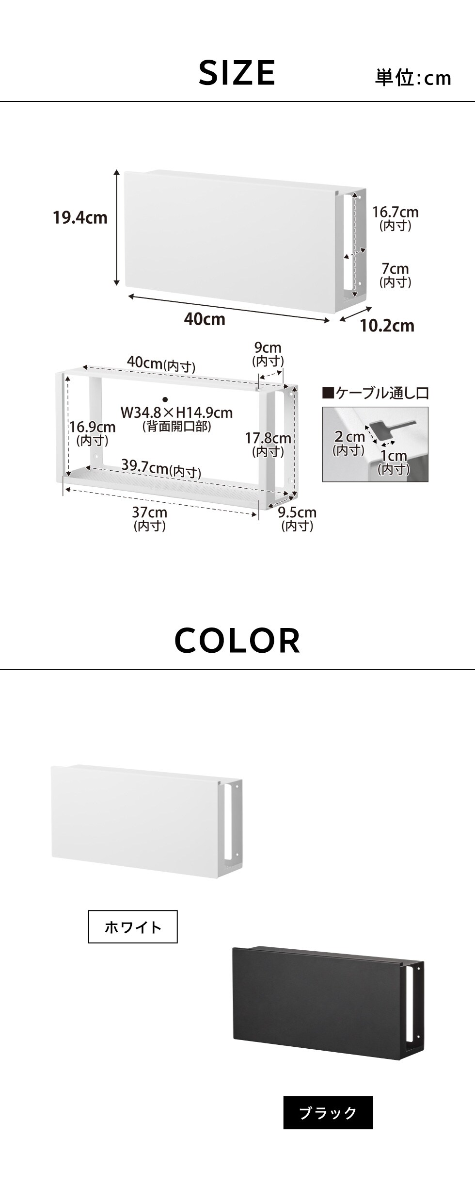 ●内寸サイズ:約 収納部:W39.7×D9.5×H17.8cm 天板:W40×D9cm 前面開口部:W37×H16.9cm 背面開口部:W34.8×H14.9cm 側面開口部:D7×H16.7cm ケーブル通し口:W2×D1cm