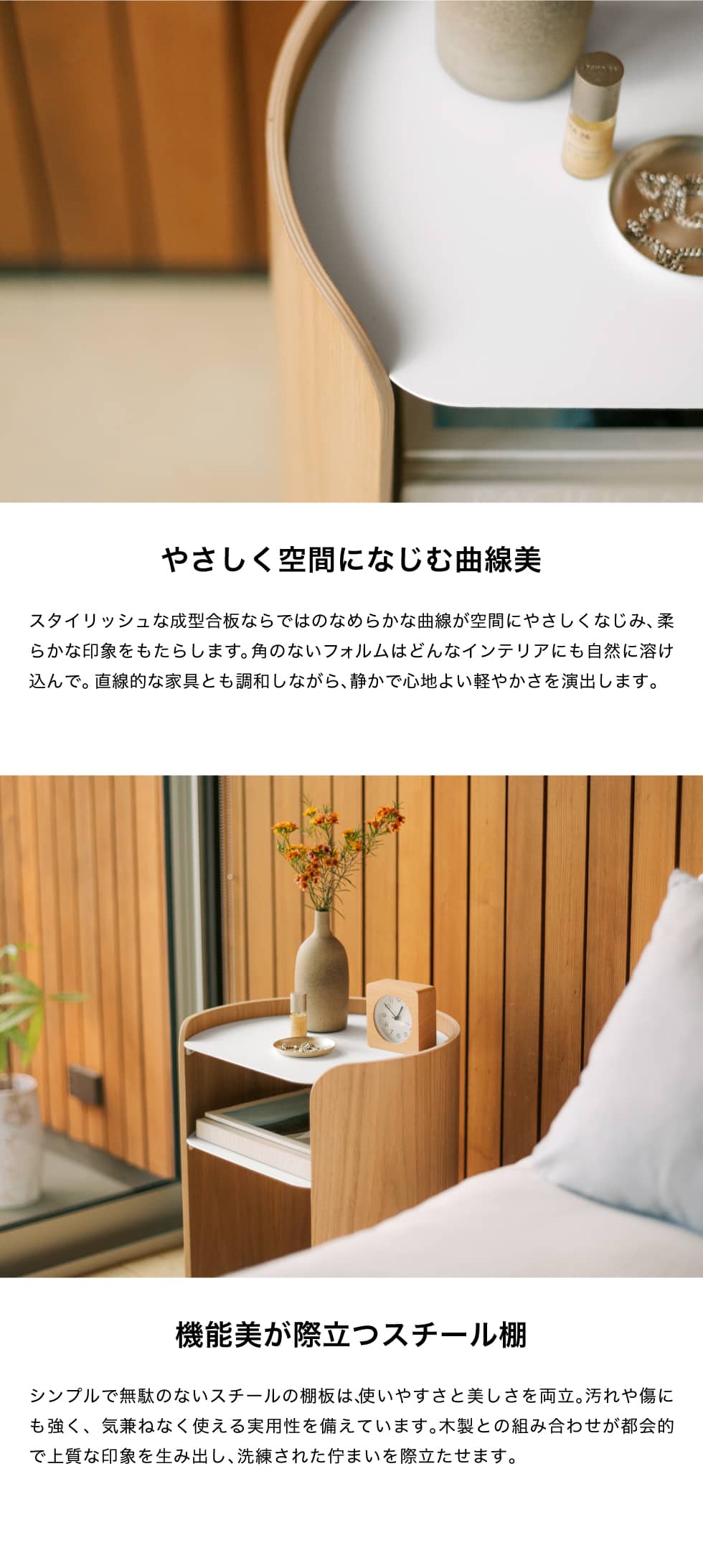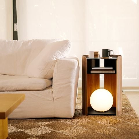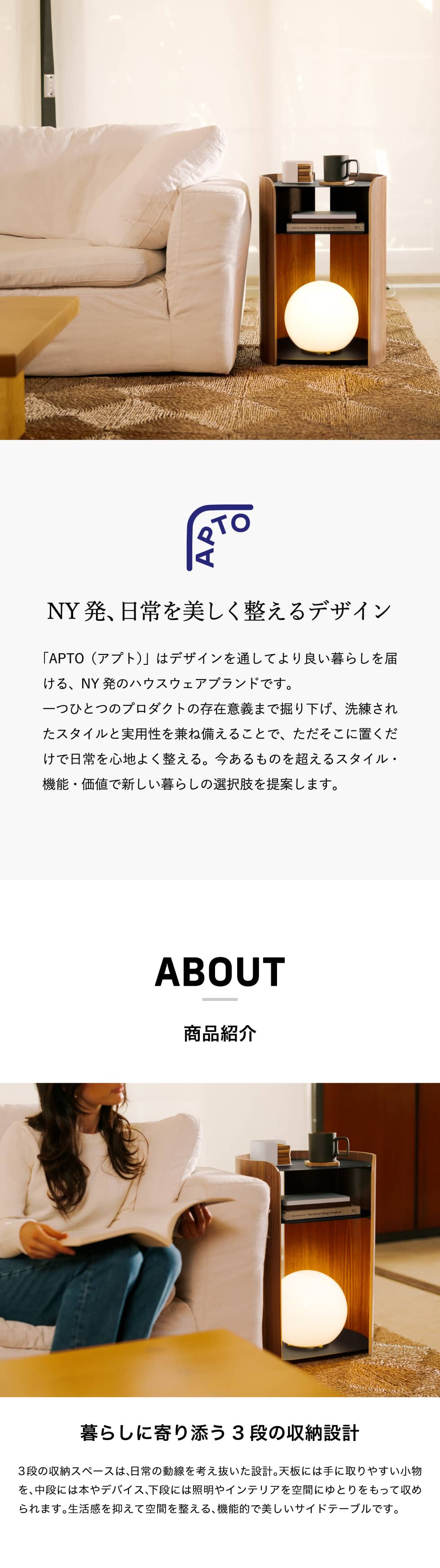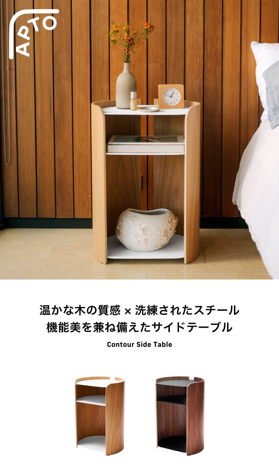 NY発のハウスウェアブランド「APTO」のサイドテーブルです。温かな木の質感を活かした曲線のフォルムとスチールの棚板を組み合わせた、様々な空間に馴染むデザイン。背面には開口部があるので、照明やスマートフォンの配線もスッキリ。洗練されたスタイルと機能美を兼ね備えた、ただそこに置くだけで日常が心地よく整うアイテムです。