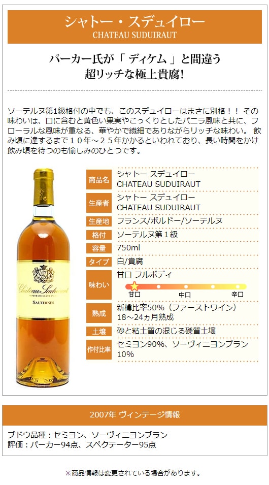 2007 シャトー スデュイロー 750ml ソーテルヌ第1級 フランス 貴腐 白ワイン コク極甘口 ^AJSU01A7^