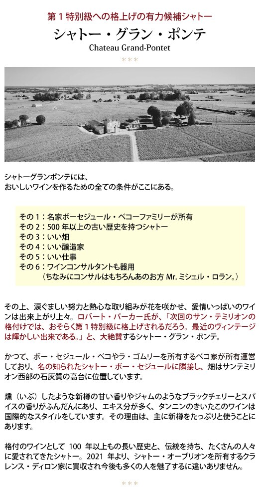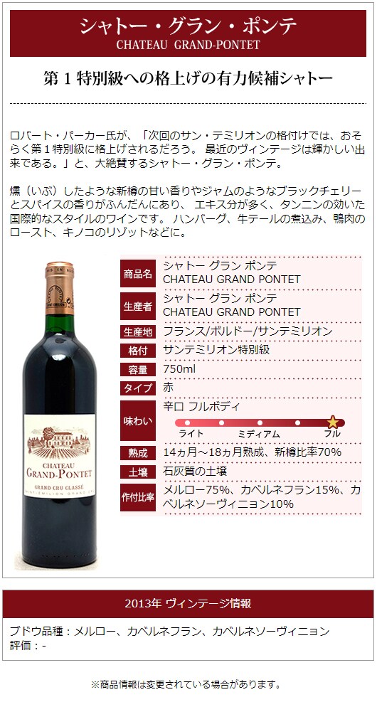 2013 シャトー グラン ポンテ 750ml サンテミリオン特別級 赤ワイン コク辛口 ワイン ^AKGP0113^