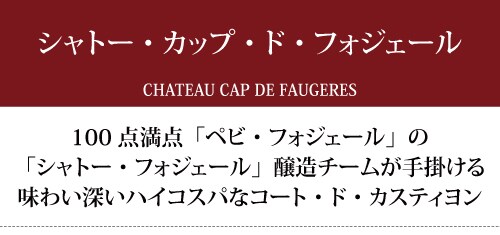 パーカー氏が2005年ものに100点満点の評価をした特別キュヴェ「ペビ・フォジェール」を手掛けるサンテミリオン特別級「シャトー・フォジェール」。そのフォジェールの醸造チームが、地続きにあるコート・ド・カスティヨンで収穫したブドウで作るのが「シャトー・カップ・ド・フォジェール」。