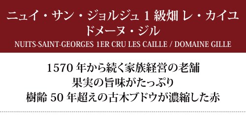 ニュイ・サン・ジョルジュの南の斜面にある「レ・カイユ」の小石の多い区画で育った樹齢50年超えの古木ブドウ使用。ニュイ・サン・ジョルジュで最も濃縮されたワイン。赤いベリーの心地よい香りに、カシス、ブラックベリー、スミレの香りがほのかに漂います。濃縮されたタンニンと自然な酸味がバランスよく調和し、エレガントでコクのある複雑なワインに躍動感を与えています。余韻は長く、タンニンがバニラの香りを際立たせます。熟成したチーズ、グリルした肉、スパイスの利いた料理と一緒に。
