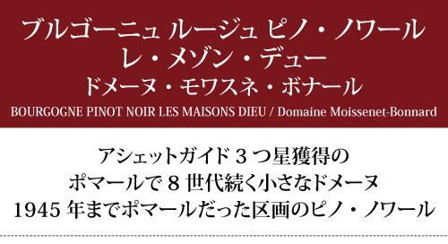 1945年までポマールに含まれていた区画「レ・メゾン・デュー」で手摘みされた樹齢30年の古木ピノ・ノワール使用。カシスとチェリーの強い香りがし、口に含むとしっかりとしたベルベットのような舌触りで、豊かなタンニンと余韻が楽しめます。ウズラや牛肉料理、マグロのステーキ、白身魚の切り身のオリーブオイル漬け、ブルソー、ボーフォール、ショームなどのチーズに。