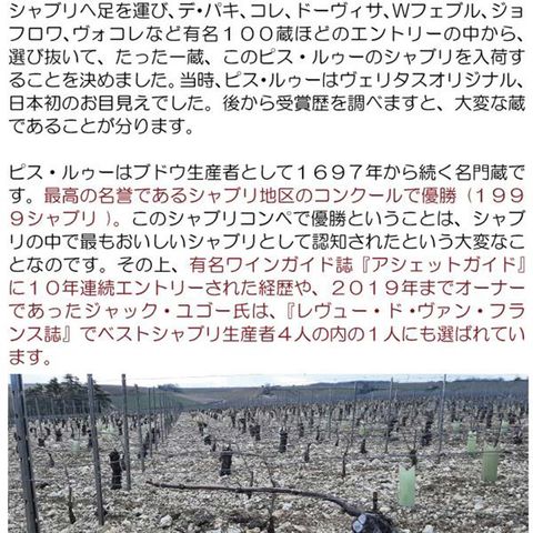 ピス・ルゥーはブドウ生産者として1697年から続く名門蔵です。最高の名誉であるシャブリ地区のコンクールで優勝(1999シャブリ)。このシャブリコンペで優勝ということは、シャブリの中で最もおいしいシャブリとして認知されたという大変なことなのです。その上、有名ワインガイド誌『アシェットガイド』に10年連続エントリーされた経歴や、2019年までオーナーであったジャック・ユゴー氏は、『レヴュー・ド・ヴァン・フランス誌』でベストシャブリ生産者4人の内の1人にも選ばれています。
