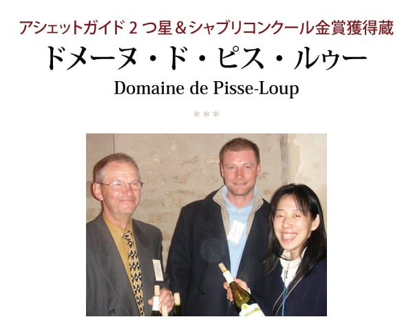 シャブリへ足を運び、デ・パキ、コレ、ドーヴィサ、Wフェブル、ジョフロワ、ヴォコレなど有名100蔵ほどのエントリーの中から、選び抜いて、たった一蔵、このピス・ルゥーのシャブリを入荷することを決めました。当時、ピス・ルゥーはヴェリタスオリジナル、日本初のお目見えでした。後から受賞歴を調べますと、大変な蔵であることが分ります。
