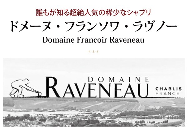 ワインに詳しい人でなくても、名前くらいは知っているシャブリ。そのシャブリの中で、古典的シャブリとして随一の名ドメーヌといわれるのが「フランソワ・ラヴノー」。パーカー氏が5つ星の最高評価を付け、2002年の「レ・クロ」には、98~100点!を付け、以降も90点台後半を連発するスーパー・シャブリ蔵です。
