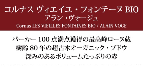パーカー氏は、「コルナス ヴィエイユ・フォンテーヌ」の2010年ものに、100点満点!「私が味わった中でも、数少ないパーフェクトなコルナスのひとつ。春の花、砕いた石、鉛筆の削りくず、ブルーベリーとブラックベリーのリキュール、甘草にトリュフなどの驚くべき香り。すべてが完璧に統合された、コクのある深いタンニンのフルボディ。これは、北ローヌの記念碑的なワインだ。次の25~30年以上に渡り飲むことができる。アラン・ヴォージュはコルナスのスーパースターだ。」と、褒めちぎりの大絶賛をしています。