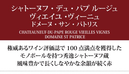 フランスで最も権威あるワイン雑誌のひとつ「レビュー・デュ・ヴァン」で100点満点獲得、パーカーポイント最高~96点獲得のモノポール「クロ・サン・パトリス」を持つ、歴史ある秀逸シャトーヌフ蔵。