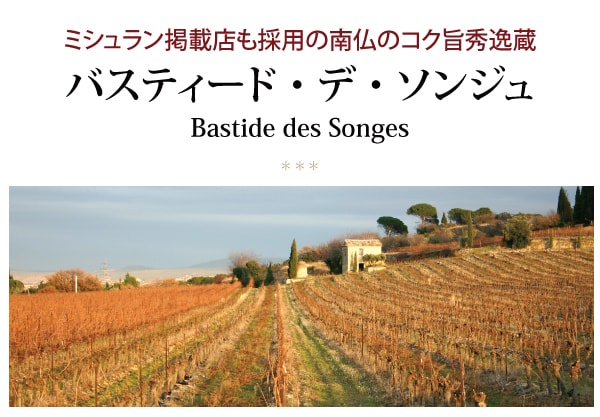 南仏で30年以上に渡りブドウ栽培を営む家族経営の秀逸蔵「バスティード・デ・ソンジュ」。ミシュラン掲載の超一流レストランやホテルでもリストオンされる実績を持ち、日本でも、人気ワイン誌「リアルワインガイド 44号」で、「レ・ムーリエール ヴァン・ド・ペイ・ド・レロー」の超優良年2005年ものが、見事、旨安大賞受賞!