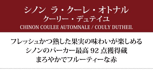 フレッシュかつ熟した果実の味わいが楽しめるシノンの秀逸蔵。パーカー最高92点獲得。