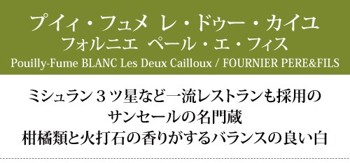 プイィ フュメの3つの村のブドウを厳選。凝縮した柑橘系果実と火打石の特徴的な香り。絹のような質感と洗練されたバランスの良い味わいの白。スパイスの効いたシーフードなどに。