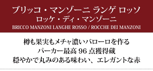 世界的にも最高級ワインの地位にある「バローロ」。中でも「ゴッドハンド」と呼ぶに相応しい凄腕の超秀逸蔵が、「ロッケ・ディ・マンゾーニ」。世界的評論家ロバート・パーカー氏が、「2004年 バローロ・サント・ステファーノ」に、驚愕の96点の高評価!ピエモンテ最高の赤ワインの生産者にも選ばれました。