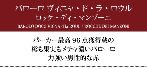 世界的にも最高級ワインの地位にある「バローロ」。中でも「ゴッドハンド」と呼ぶに相応しい凄腕の超秀逸蔵が、「ロッケ・ディ・マンゾーニ」。世界的評論家ロバート・パーカー氏が、「2004年 バローロ・サント・ステファーノ」に、驚愕の96点の高評価!ピエモンテ最高の赤ワインの生産者にも選ばれました。