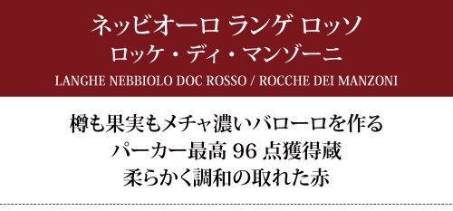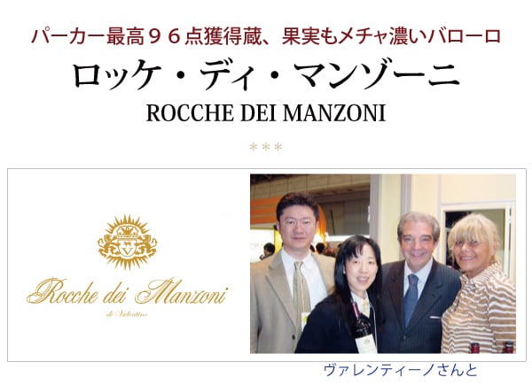 世界的にも最高級ワインの地位にある「バローロ」。中でも「ゴッドハンド」と呼ぶに相応しい凄腕の超秀逸蔵が、「ロッケ・ディ・マンゾーニ」。世界的評論家ロバート・パーカー氏が、「2004年 バローロ・サント・ステファーノ」に、驚愕の96点の高評価!ピエモンテ最高の赤ワインの生産者にも選ばれました。