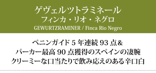 「リオネグロ・ティント」は、力強くバランスのとれた味わいの樽ったるのフルボディの赤、スペインでは珍しい「ゲヴェルツトラミネール」は、非常にクリーミーな口当たりで飲み応えのある辛口白。いずれもお値段以上の素晴らしい品質で、 超お買い得アイテム!濃厚リッチなフルボディがお好きな方には、絶対にオススメです。