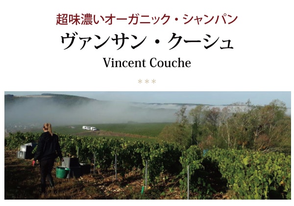 シャンパーニュ地方の最も南に位置するコート・デ・バール地区で、1945年創業のビオRMシャンパン蔵、「ヴァンサン・クーシュ」。現在、3代目の「ヴァンサン・クーシュ氏」が当主となり、今や、愛好家からも大注目を浴びる超こだわりの作り手。