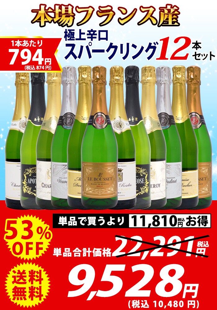 送料無料 ワイン ワインセット 本場フランス産の極上辛口スパークリングワイン12本セット (6種類各2本) ^W0AC78SE^