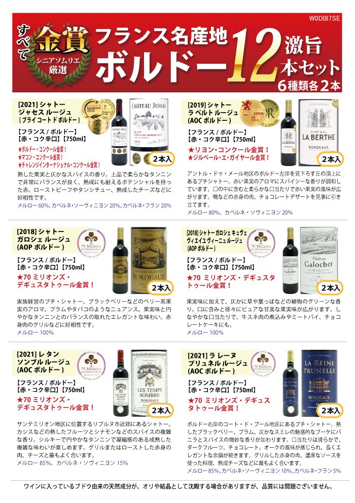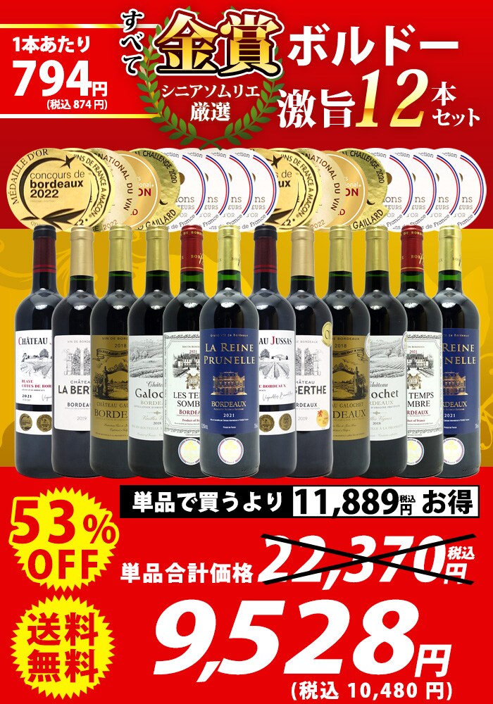 送料無料 ワイン ワインセット すべて金賞フランス名産地ボルドー激旨赤12本セット (6種類12本) ^W0DI95SE^