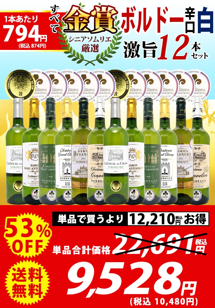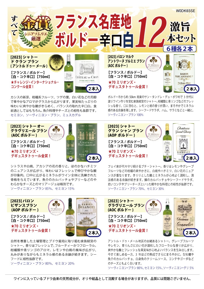送料無料 ワイン ワインセット すべて金賞 名産地フランス辛口白激旨12本セット (6種各2本) ^W0DK65SE^