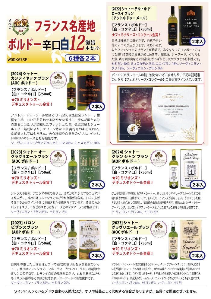 送料無料 ワイン ワインセット すべて金賞 名産地フランス辛口白激旨12本セット (6種各2本) ^W0DK67SE^