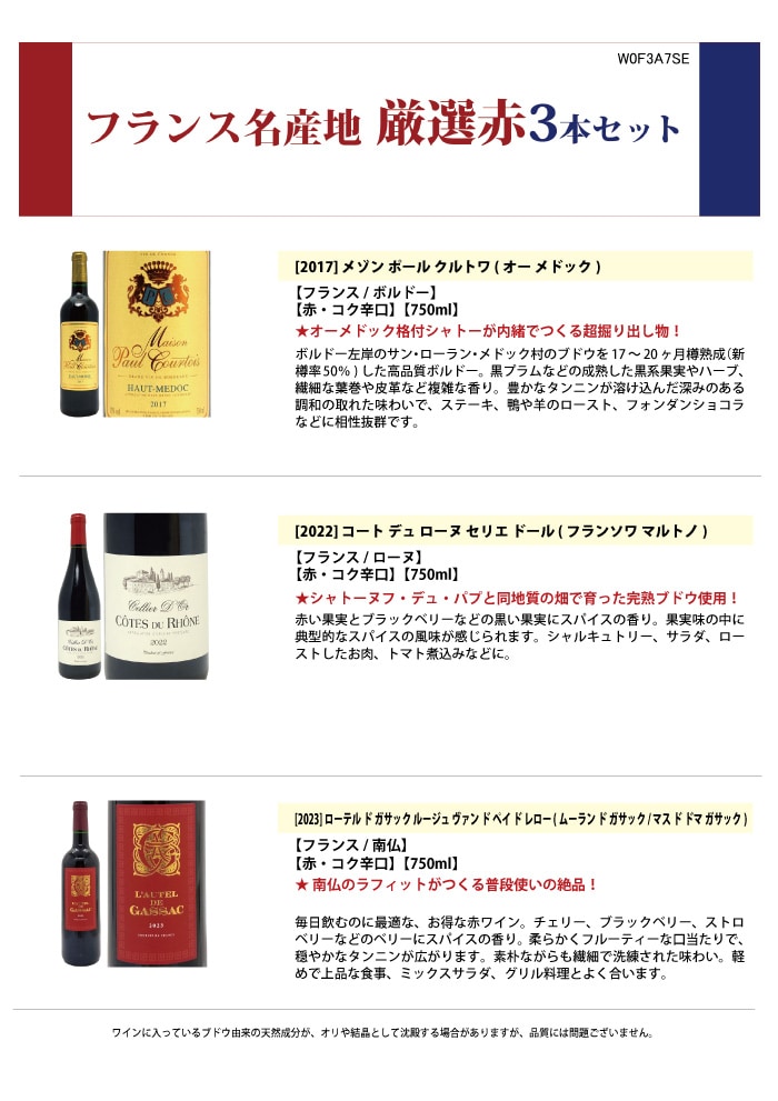 送料無料 ワイン ワインセット フランス名産地の有名ワイン 厳選赤3本セット ^W0F3A7SE^