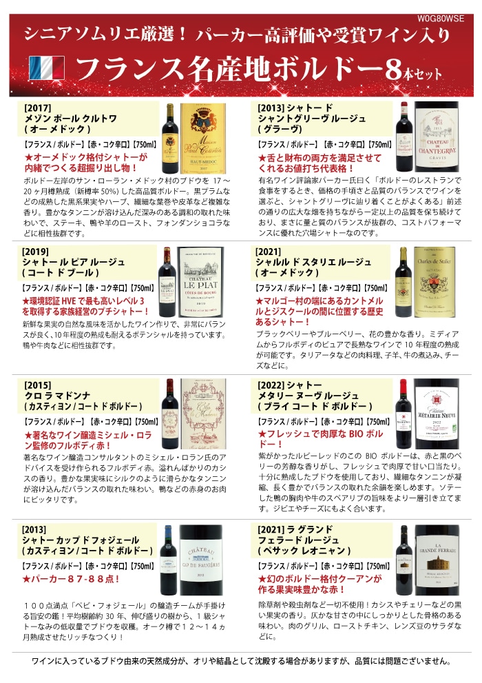 送料無料 ワイン ワインセット シニアソムリエ厳選 ボルドー赤8本セット ^W0G80WSE^