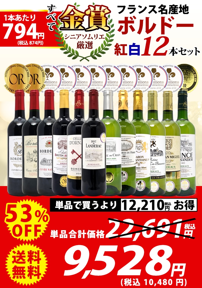 送料無料 ワイン ワインセット すべて金賞フランス名産地ボルドー赤白12本セット (赤6本+白6本) ワインセット 大人気 紅白 ^W0UK49SE^