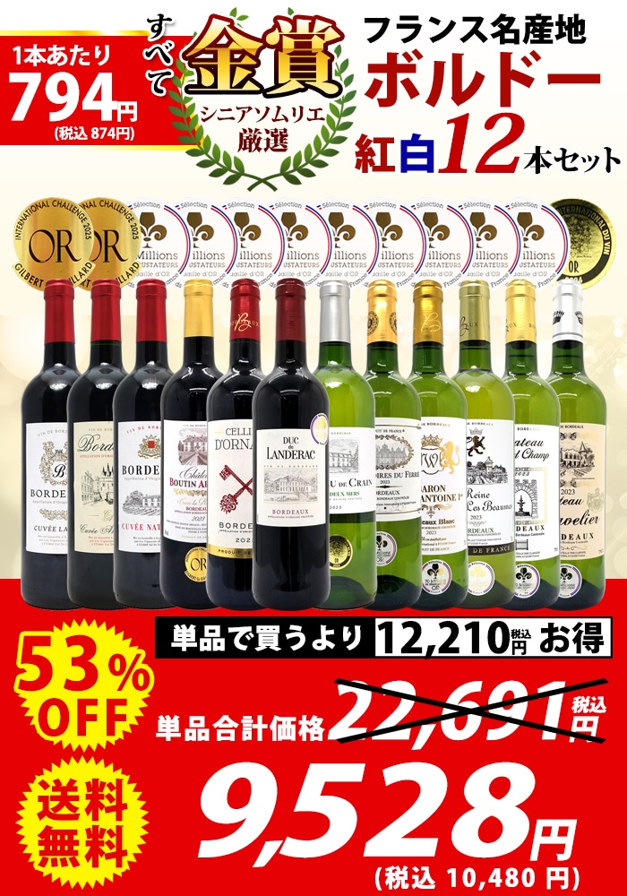 送料無料 ワイン ワインセット すべて金賞フランス名産地ボルドー赤白12本セット (赤6本+白6本) ワインセット 大人気 紅白 ^W0UK50SE^