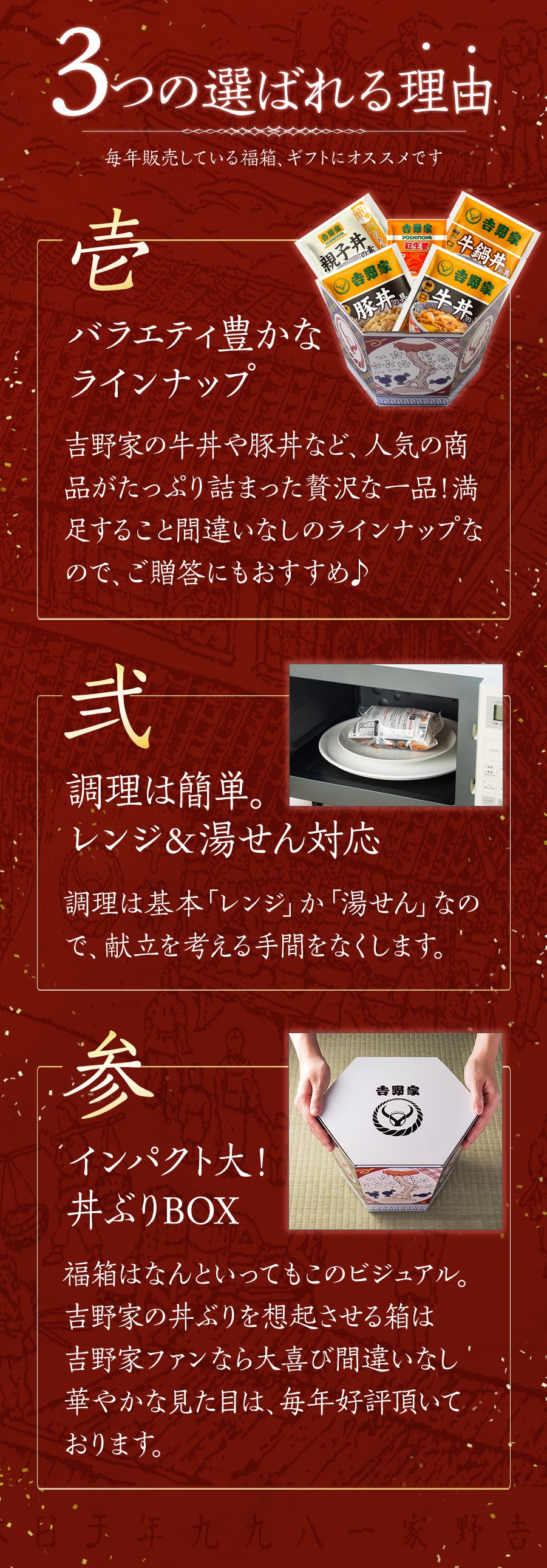 | 年末年始の大人気商品! 吉野家の丼をイメージした特製ギフト箱でお届け。 人気の商品を詰め合わせた吉野家オリジナルどんぶり福箱セットです。 吉野家の店舗をご利用いただいているお客様はもちろん、普段お世話になっている方へのプレゼントにもぴったり。※どんぶり本体は付属いたしません。 |