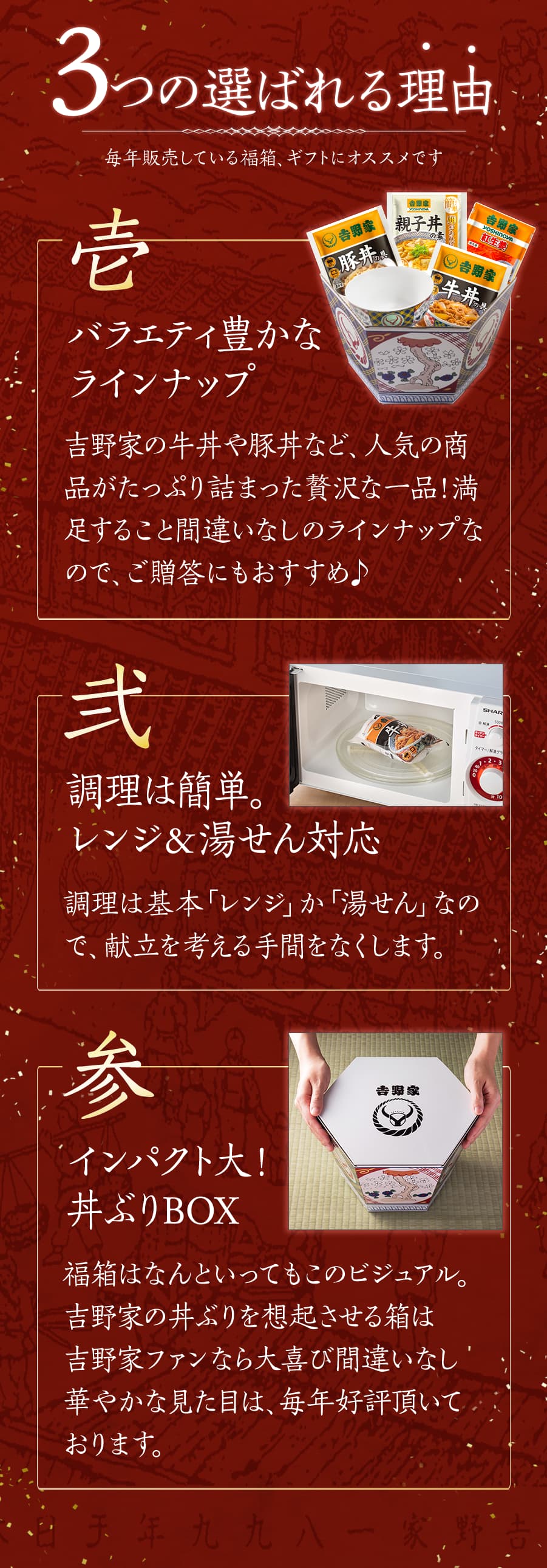 | 毎年お客様からご好評をいただいている福箱。人気の商品を詰め合わせた吉野家オリジナルどんぶり福箱セットです。 吉野家の店舗をご利用いただいているお客様はもちろん、普段お世話になっている方へのプレゼントにもぴったり。吉野家の丼をイメージした特製ギフト箱でお届けします。※どんぶり本体は付属いたしません。 |