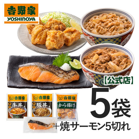 【吉野家】公式 おかず4品10袋セット(冷凍牛丼の具2袋、冷凍豚丼の具2袋、から揚げ1袋、焼サーモン5切れ)【冷凍】 冷凍食品 おかず 惣菜 唐揚げ 鶏肉 お弁当