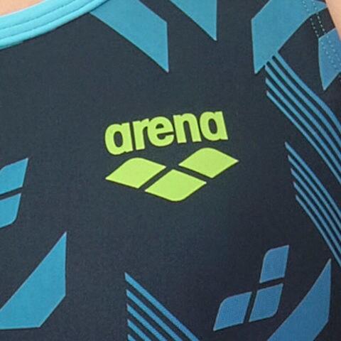 胸元に斜めに入った幾何学的な模様がラバープリントで表現され、背中から脚にかけて入ったステッチデザインが体をすっきり見せてくれるようなデザイン。